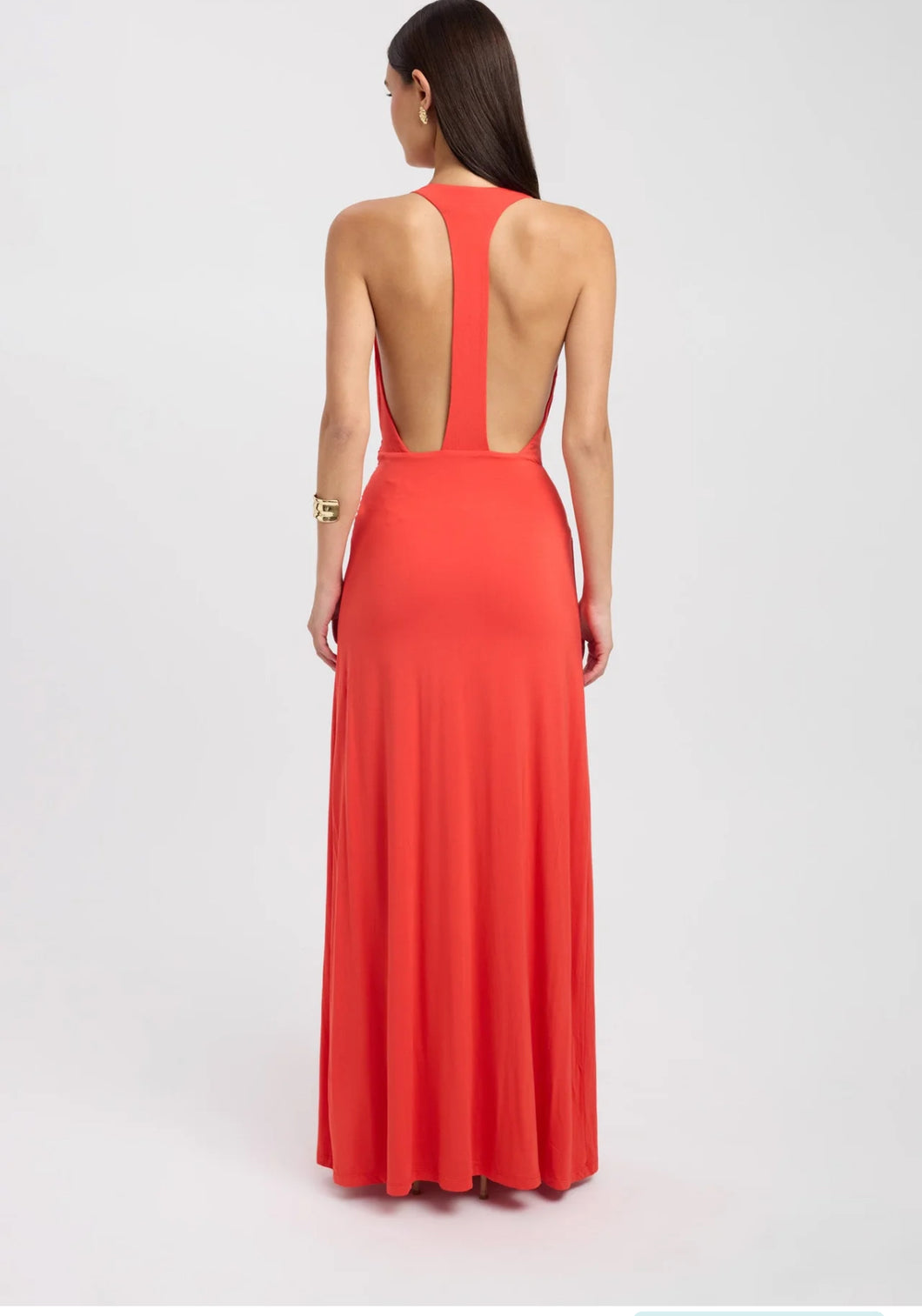 The Jasmine Maxi Dress delivers effortless elegance with its fluid silhouette and refined details. A plunging halter neckline lengthens the frame, while the softly draped bodice and adjustable sash-style waist tie add shape and movement. The sleek racerback balances the dramatic front, flowing into a full-length skirt that moves beautifully with every step - ideal for evenings that call for a polished, understated look.